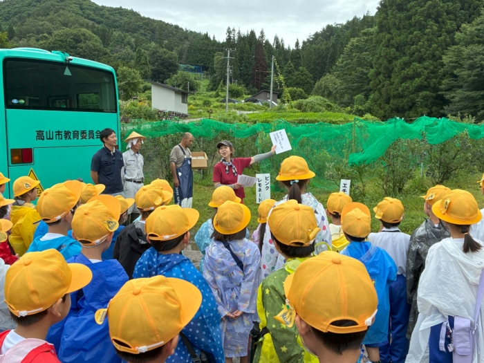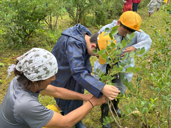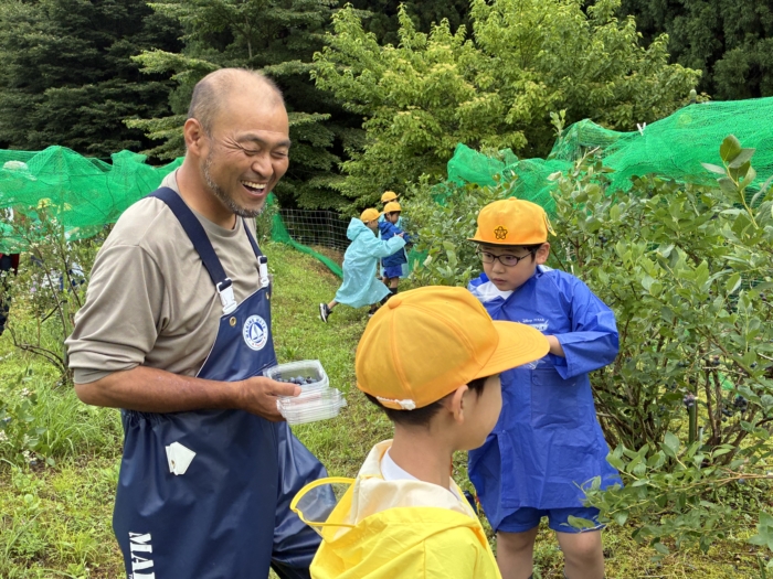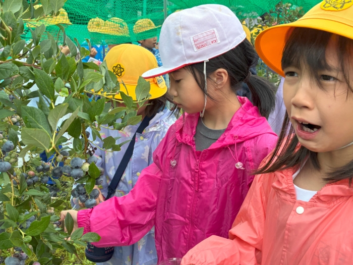 7月17日、国府小学校の子供たちを招いて、自社で育てているブルーベリーの収穫体験をしてもらいました。
